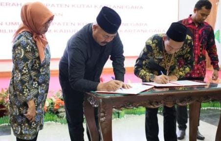 Penandatanganan naskah hibah, oleh Bupati Kukar Edi Damansyah, KPU dan Bawaslu. (Ist)