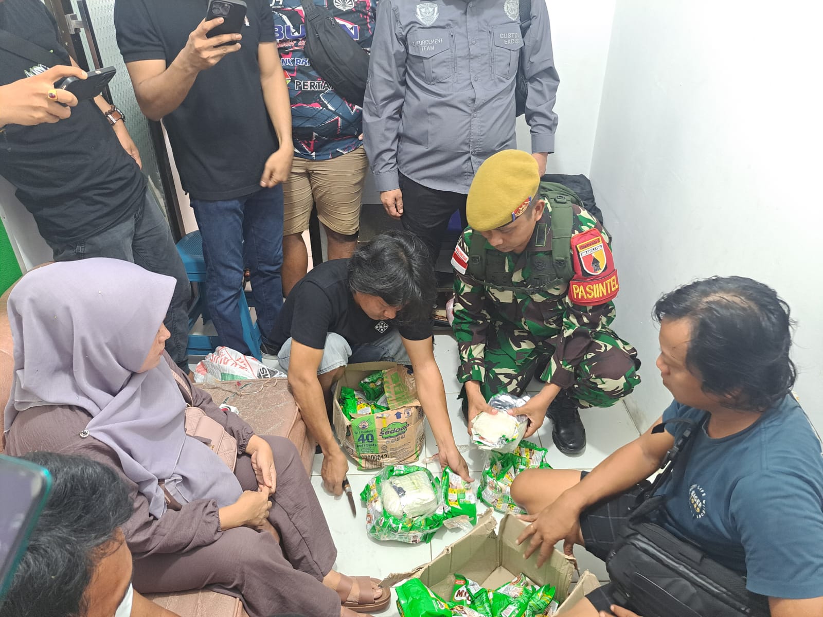 Sesampainya di Dermaga, personel gabungan tersebut berjaga dan sekitar pukul 15.50 WITA seorang yang dicuriga berinisial SB didapati membawa tas jinjing dan karung, seketika personel gabungan memeriksa barang bawaannya dan ditemukan narkotika sebanyak 2 bungkus yang dibalut kemasan susu bubuk di dalam karung.