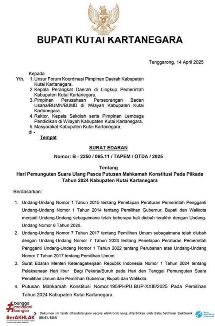 “Bahwa pada hari Sabtu, 19 April 2025 ditetapkan sebagai hari libur dalam rangka pelaksanaan Pemungutan Suara Ulang Pasca Putusan Mahkamah Konstitusi pada Pemilihan Tahun 2024 Kabupaten Kutai Kartanegara, ” tegasnya.