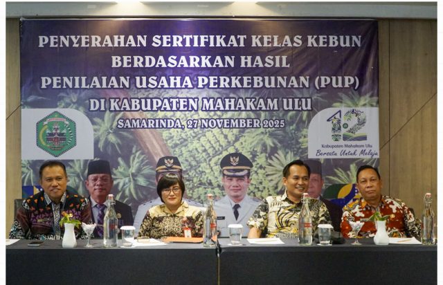 MAHAKAM ULU, Sultanews – Mewakili Bupati Mahakam Ulu (Mahulu) Angela Idang Belawan, Asisten Administrasi Umum (Asisten III) Kristina Tening, S.H., M.Si., menyerahkan Sertifikat Kelas Kebun Berdasarkan Hasil Penilaian Usaha Perkebunan (PUP) di Kabupaten Mahulu. Penyerahan yang menjadi instrumen evaluasi kinerja perusahaan perkebunan kelapa sawit ini berlangsung di Ruang Classical Lantai 3 Hotel Ibis Samarinda, Kamis (27/11/25).